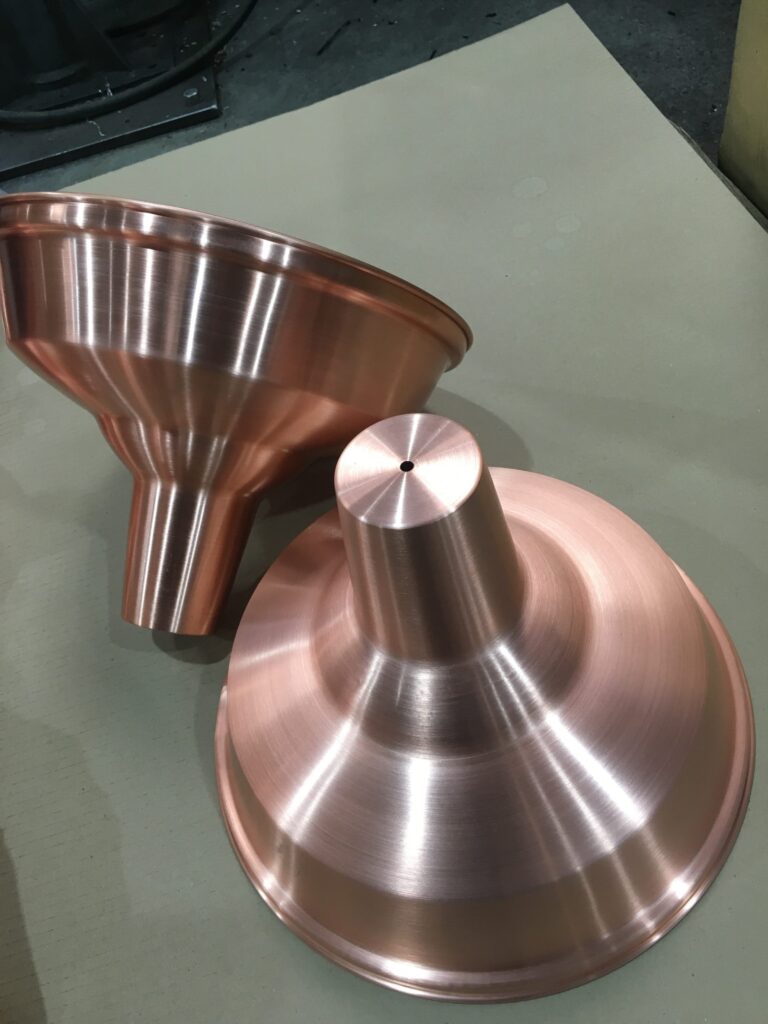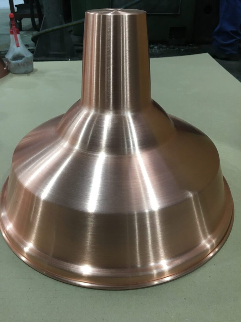 The current trend is vintage light shades made out of copper, which can be finished in a number of ways including with an aged patina, a clear coating and coloured coatings on the inside of the shade. We supply the light shades with a raw or polished finish, all done by our in-house metal polishing service